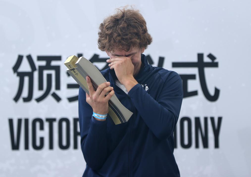 5月19日,美国选手贾格尔·伊顿在颁奖仪式上落泪。新华社记者 贾浩成 摄