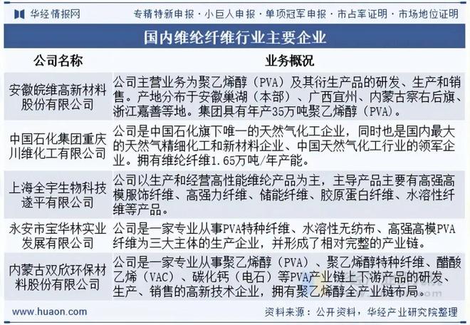 国内维纶纤维行业经过多年来的行业洗牌,行业弱势企业不断退出,PVA产品市场已逐步向市场占有率高、研发能力强、技术先进、产业链长、成本低、效益好的优势企业集中。国内维纶纤维行业集中度的不断提高,目前我国维纶纤维企业主要有安徽皖维高新、重庆川维化工、上海全宇生物科技遂平有限公司等。