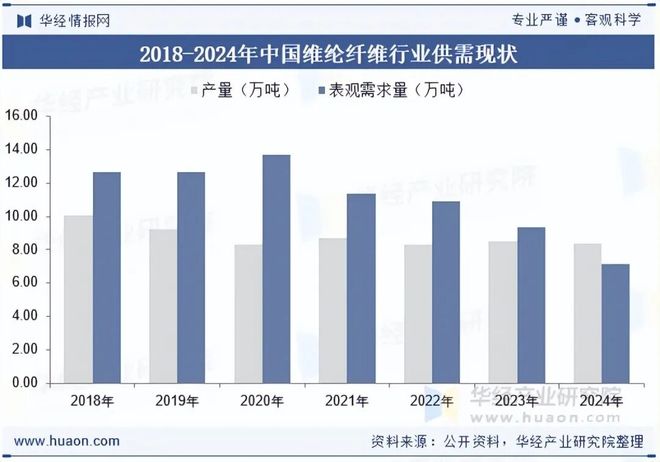 维纶纤维是当前人工合成纤维中已知吸湿性最大的品类,素有“人工棉花”之称,因其优良的柔软度、保暖性受到纺织服装业的喜爱。据统计,截至2024年中国维纶纤维行业产量为8.4万吨,表观需求量为7.15万吨。