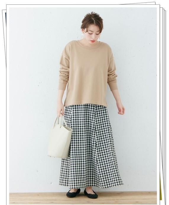 落肩的米色卫衣与黑白的棋盘格半身裙相搭配,带来舒适放松的休闲感。鞋包也选择黑白色,简单而舒适。
