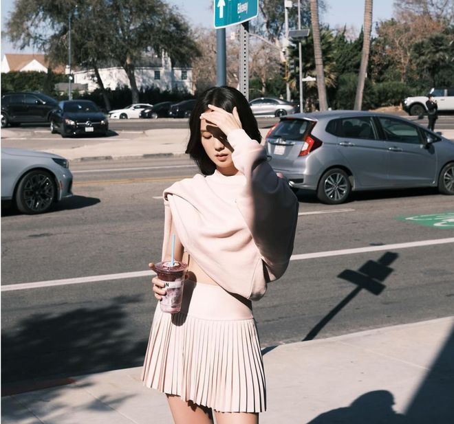 Jisoo的健康加州女孩时刻!她穿着文胸上衣,搭配网球裙,一侧是运动衫。Ergen 的冰沙是您在洛杉矶时必不可少的,是完美的配件。